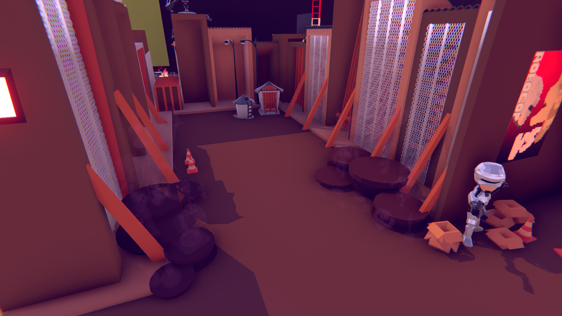 The is in the form of a "tunnel": buildings on both sides and nothing in the middle, giving a direct view of the boss